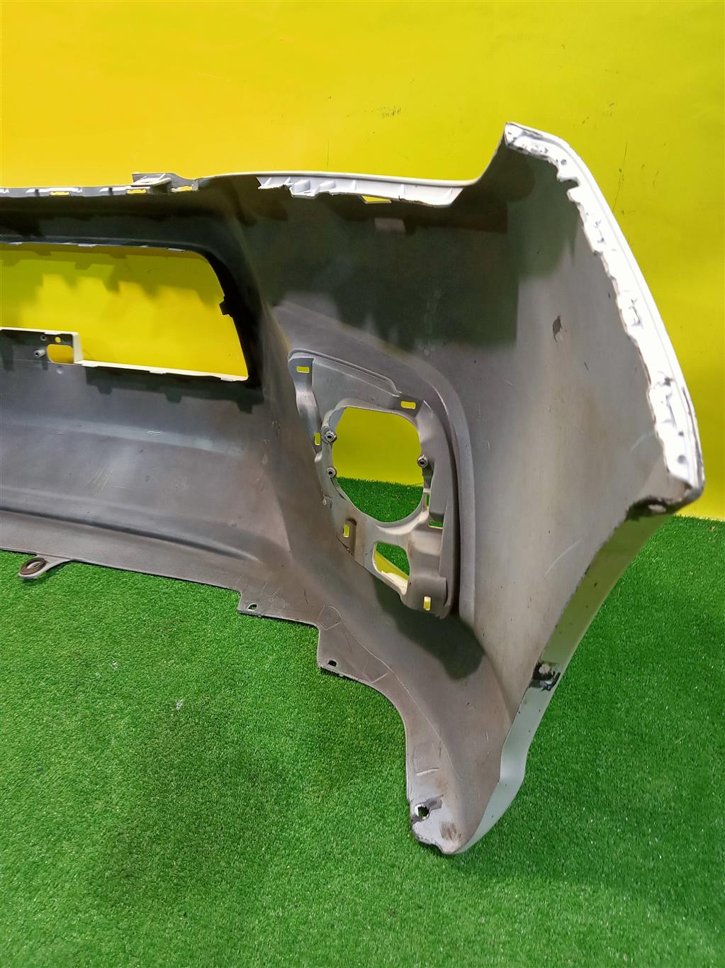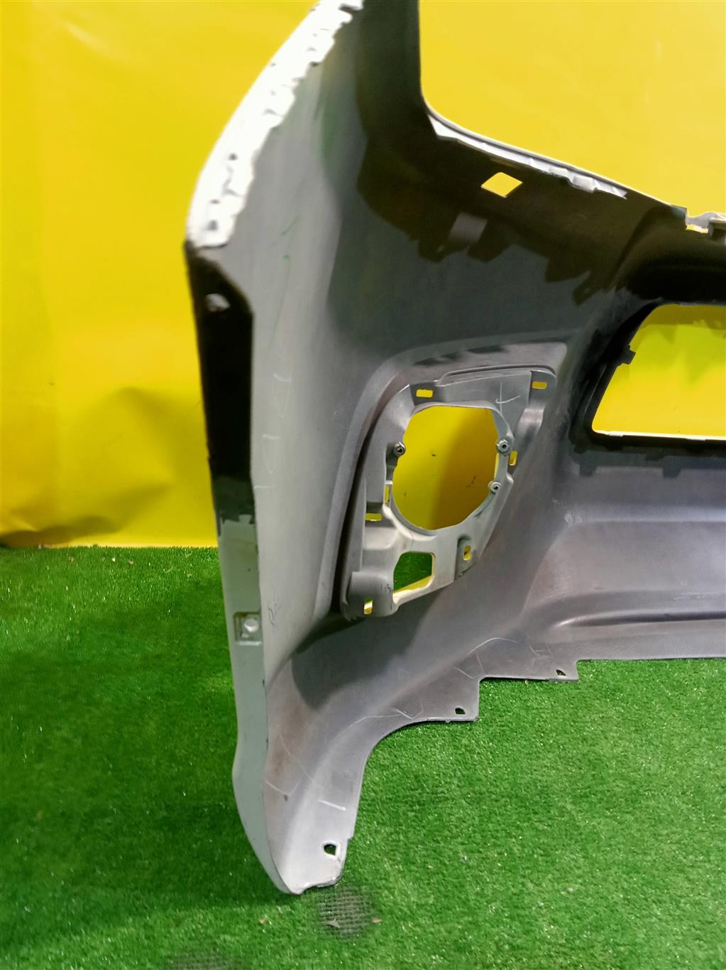 С отверстиями под омыватели фар. Имеет примятость (фото 4 и 6), проведен ремонт (фото 7 и 9).