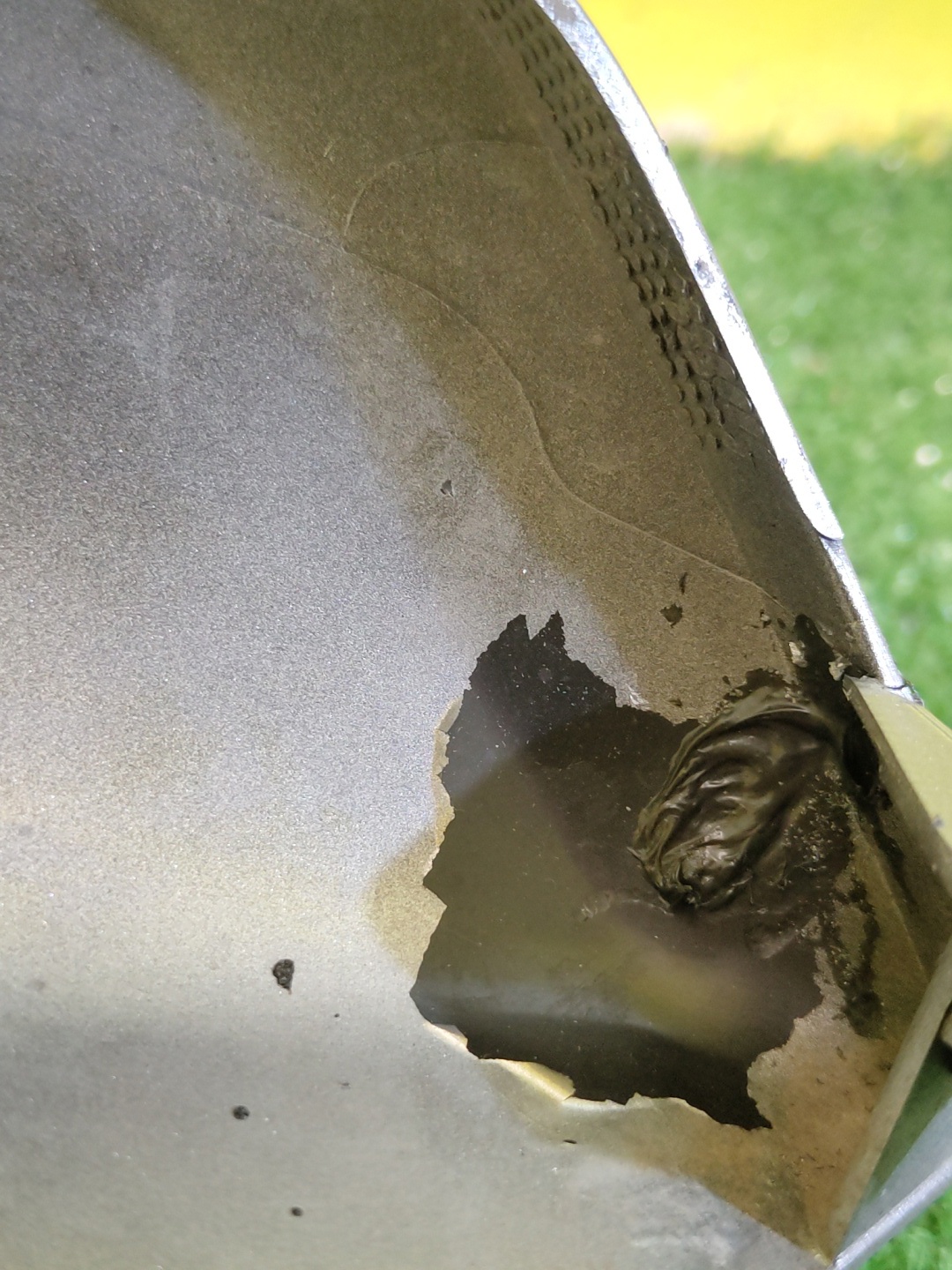 Нижняя, серебристая. Проведен ремонт. Имеет мелкие царапины.