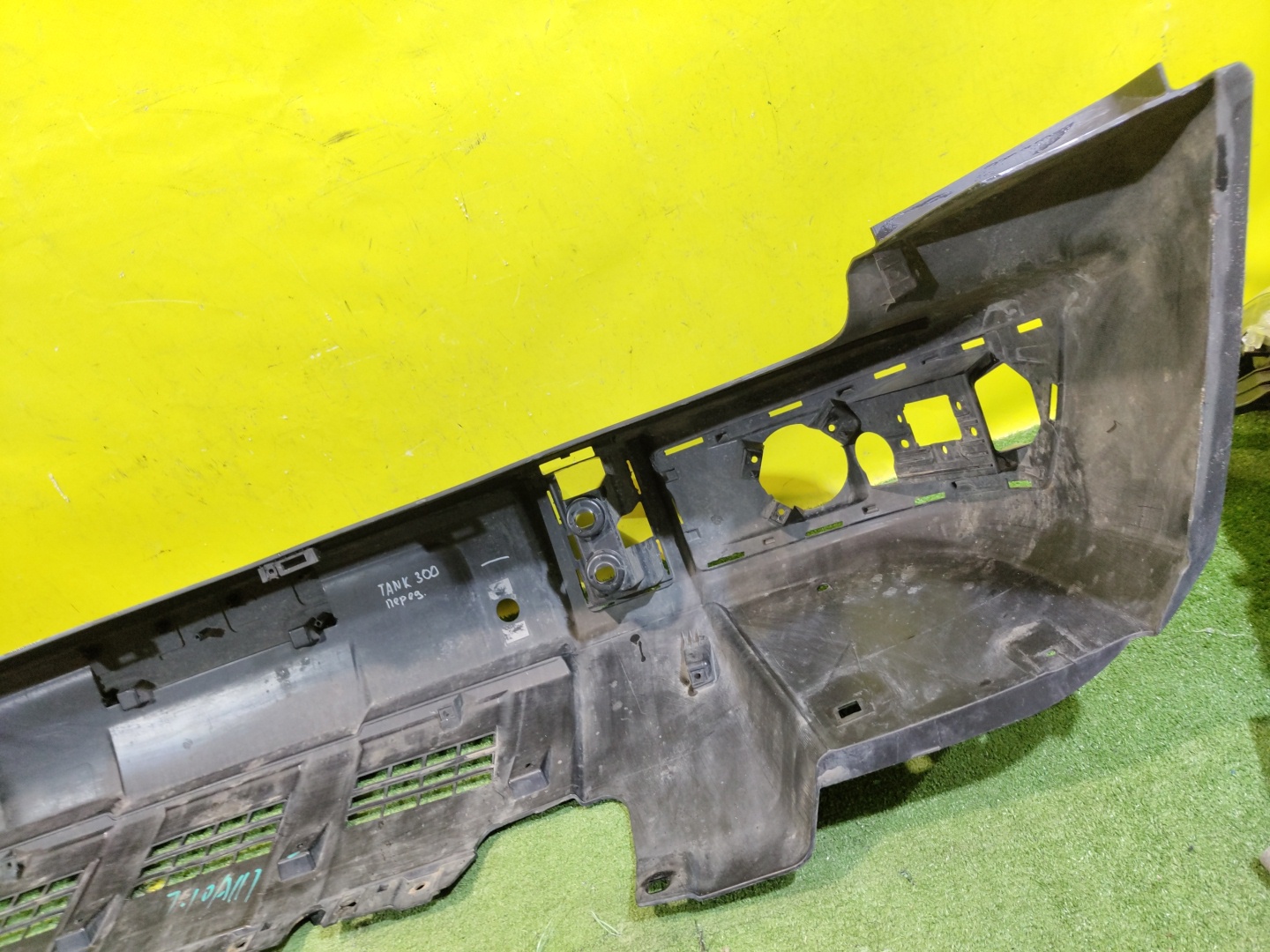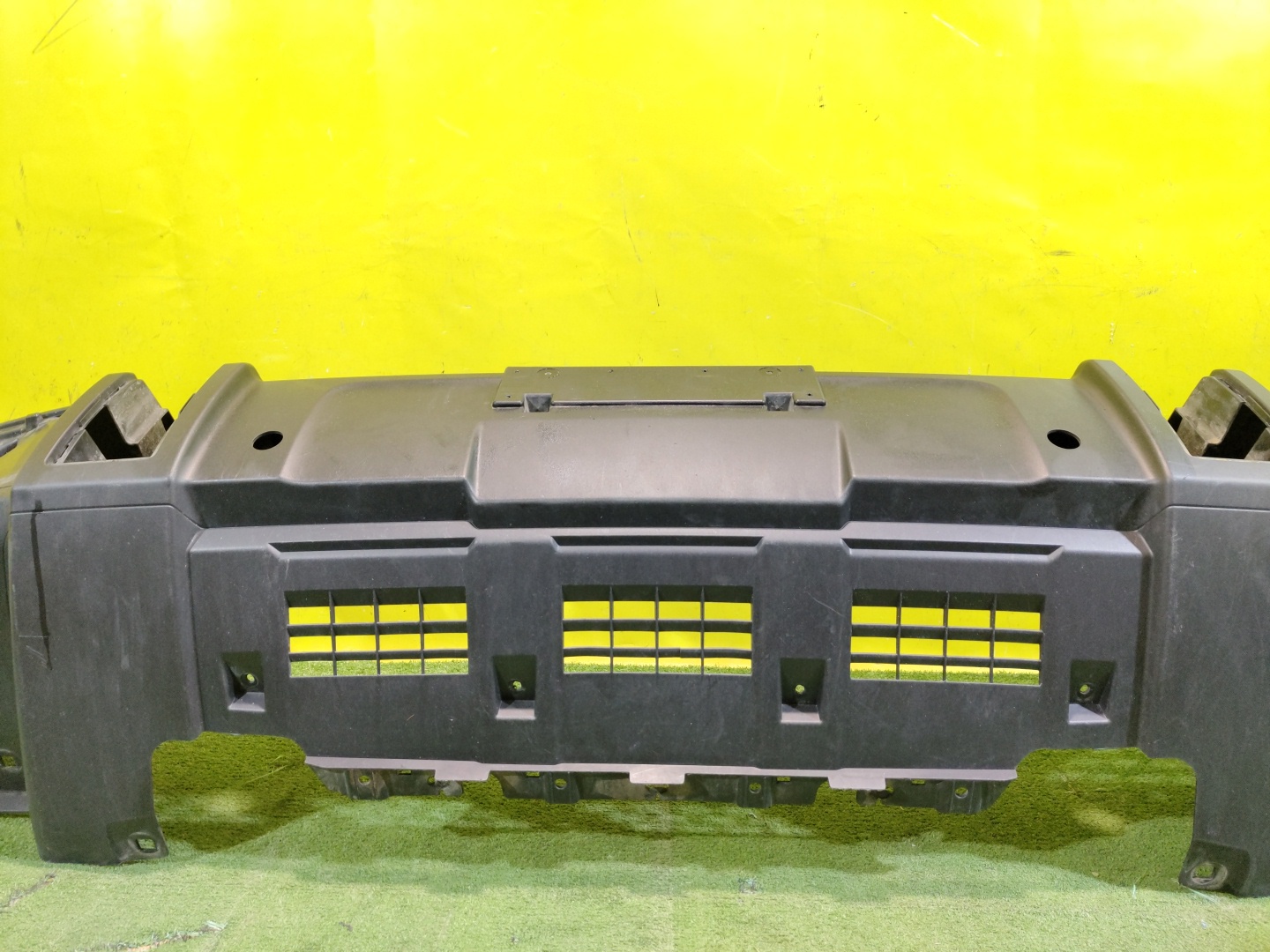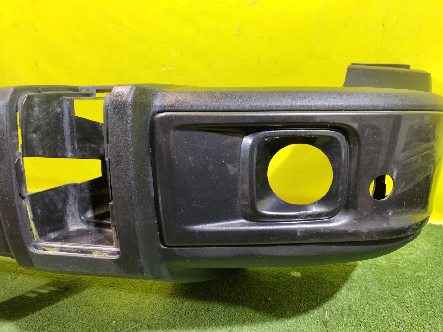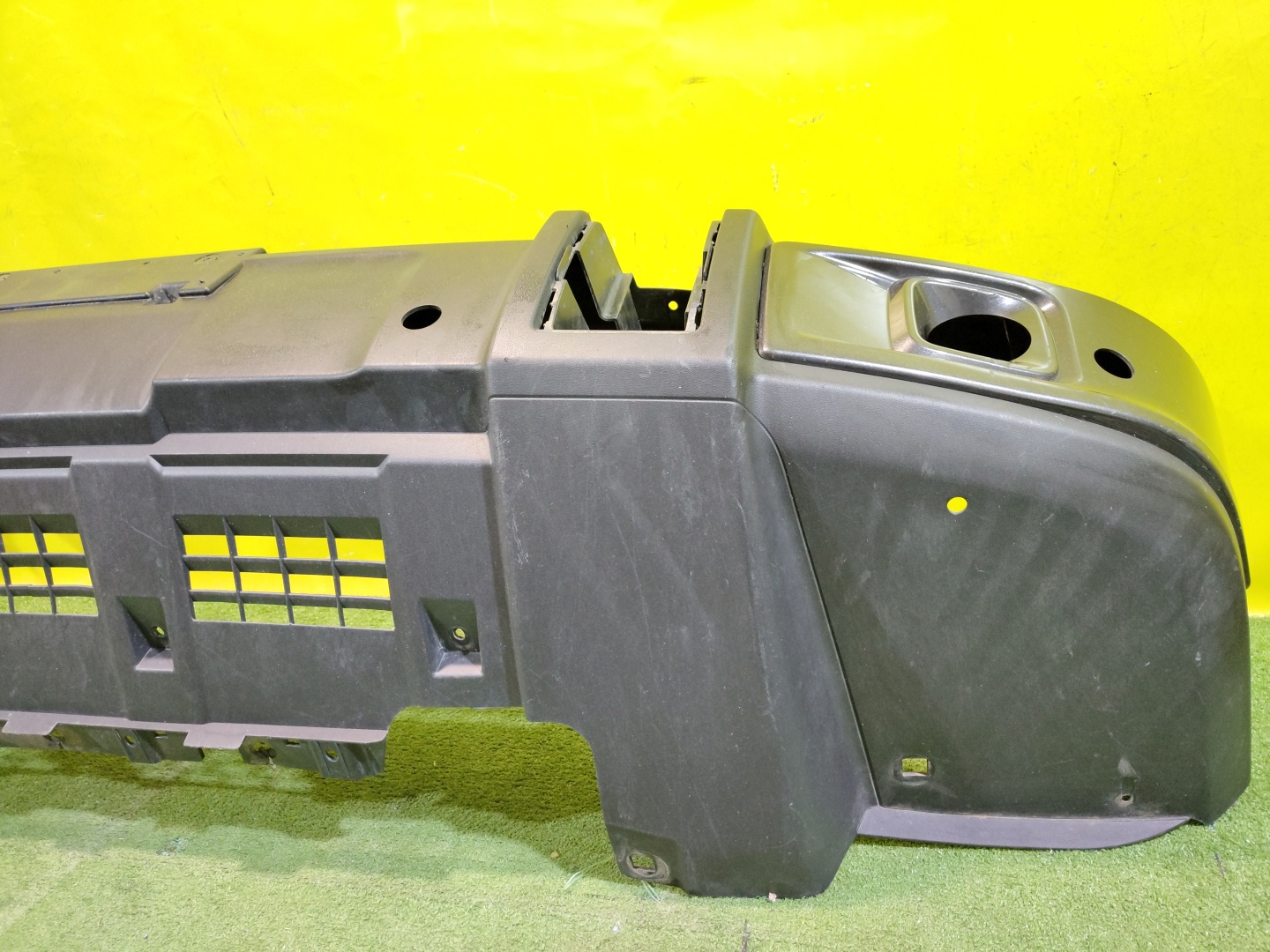 С отверстиями под парктроники. Имеет царапины и трещины на центральной решетке.