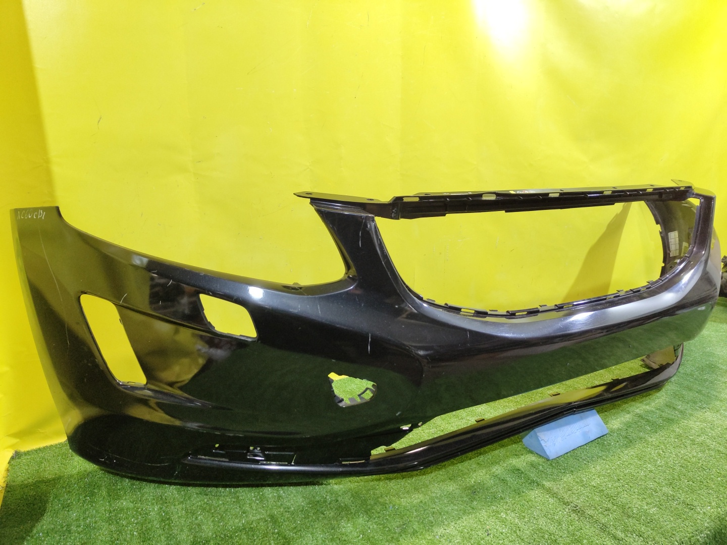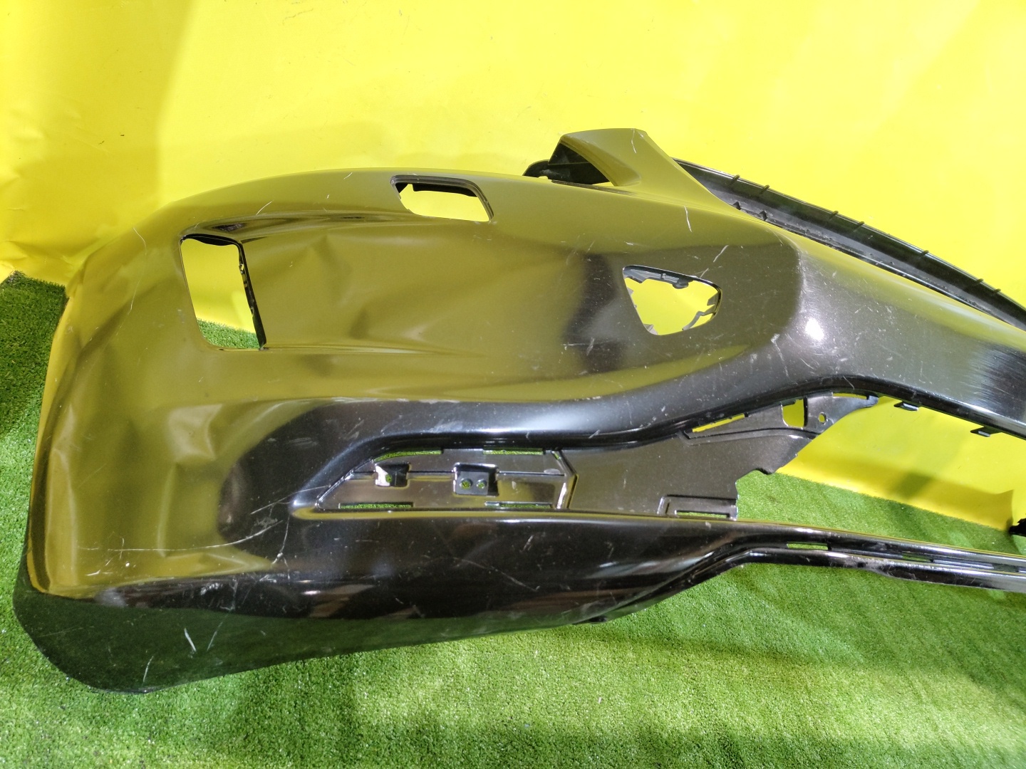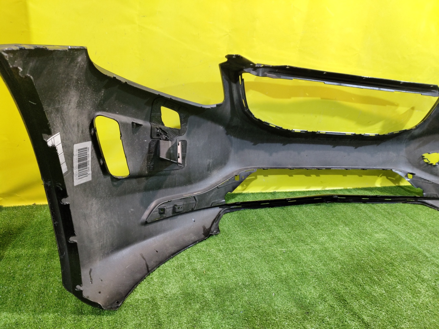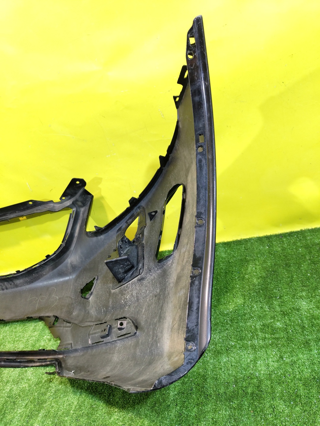 Имеет примятость (фото 6) и дефекты креплений (фото 9). С отверстиями под омыватели фар.