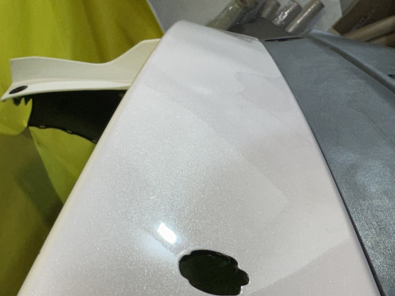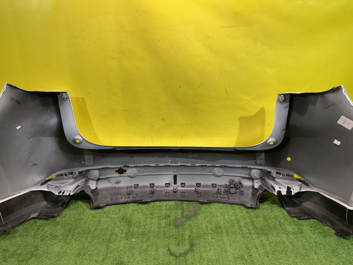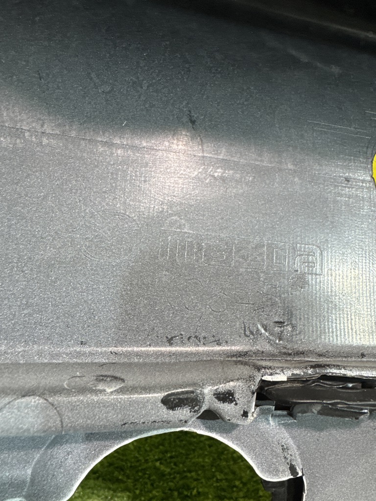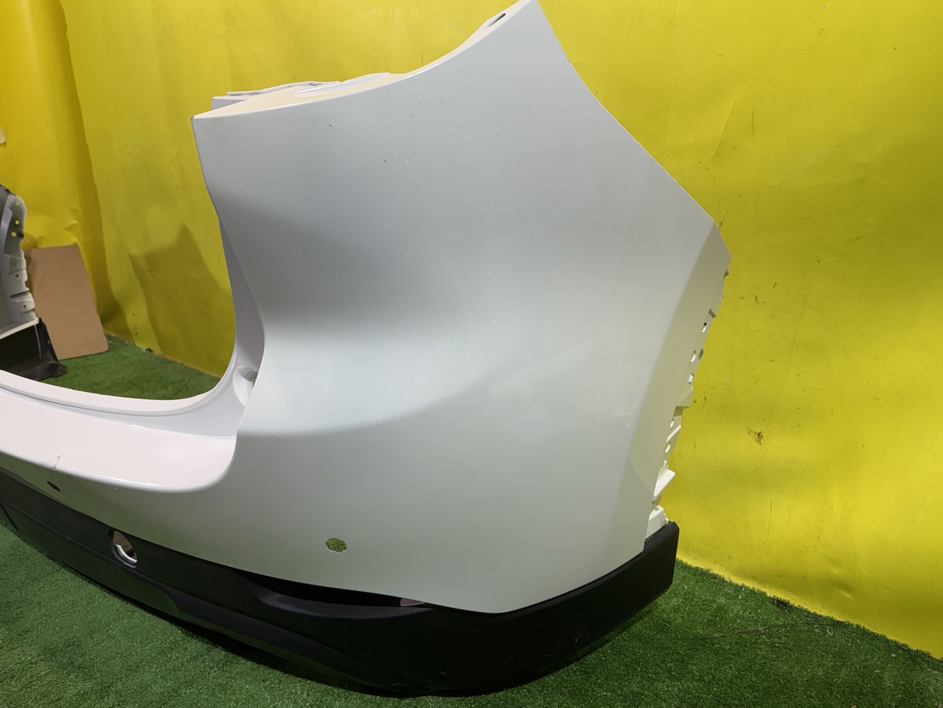 С отверстиями под парктроники. Имеет царапины и примятость (фото 4 и 5).